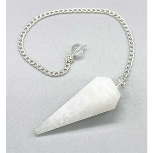 This 6-sided pendulum has a soft energy and works with the crown Chakra. White quartz may align your energy with joy, confidence, protection, and helps with negative energy and protects from the evil eye. Chain lengths may vary.