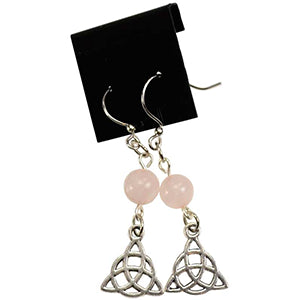 Made to function as miniature prayer beads these earrings will allow you to focus your energy with your morning or nightly meditations and the gentle swaying of the earrings as you go about your day will constantly remind you of your purpose and help you to refocus your energy and willpower if they have wandered during your travels in the mundane world. Offered with several different stones to allow you to choose the stone whose own natural energies best match your purpose. Hypo allergenic, surgical steel French hooks. Rose Quartz, Pewter, Surgical Steel. Beads are 1/4", Charms are 1/2", Overall length is 2 1/8"